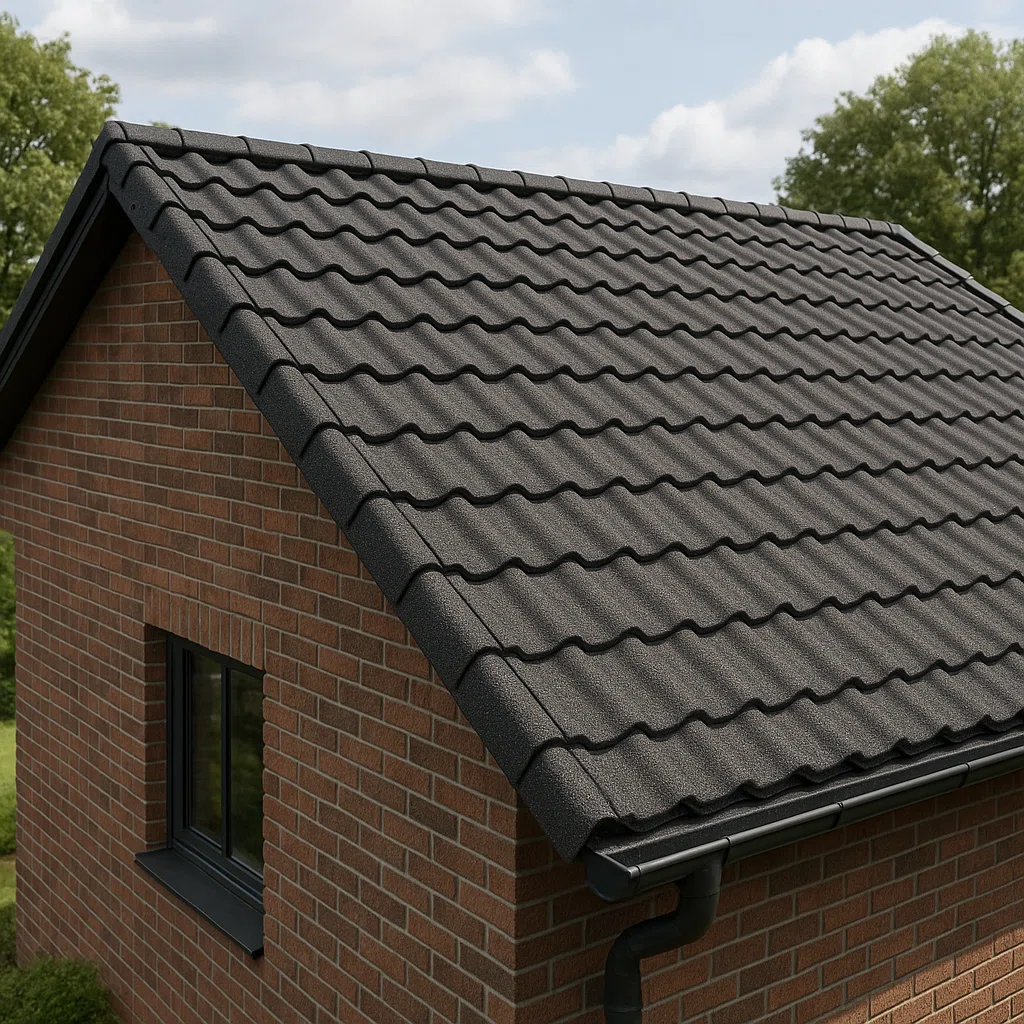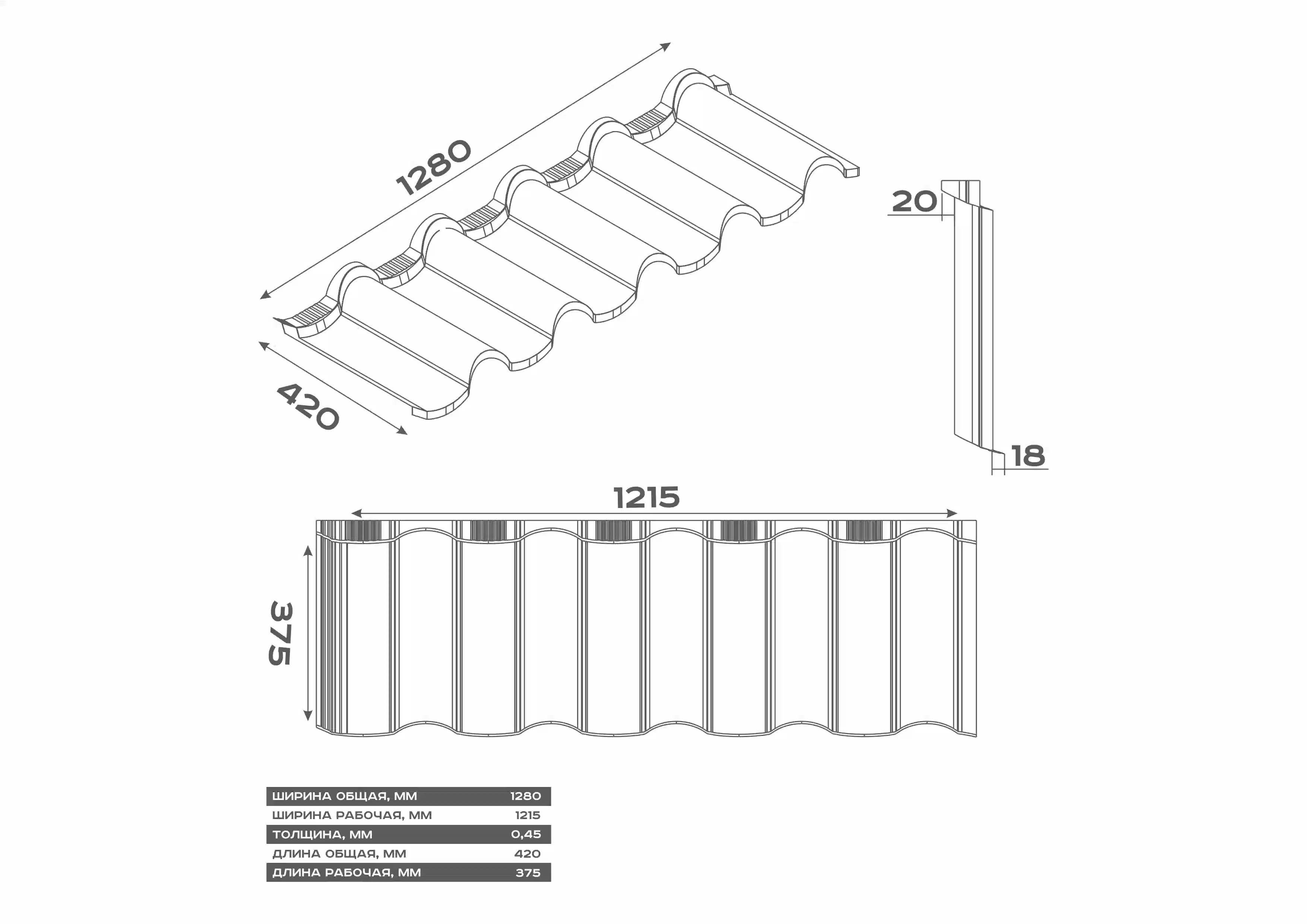 - Не подвержена горению и не издаёт шума во время дождя. Вобрала в себя лучшие свойства металлической и мягкой черепицы.