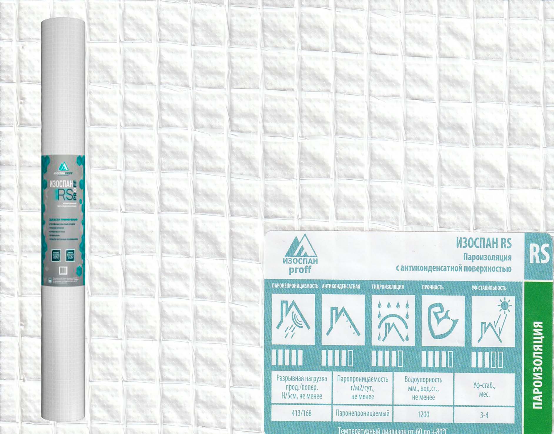 Пленка ИЗОСПАН RS паро-гидроизоляционная (70 кв.м.) - трехслойный материал, выполненный из полипропиленового нетканого полотна и полипропиленовой пленки, армированных сеткой для достижения высокой прочности. Одна сторона материала гладкая, другая — шероховатая.